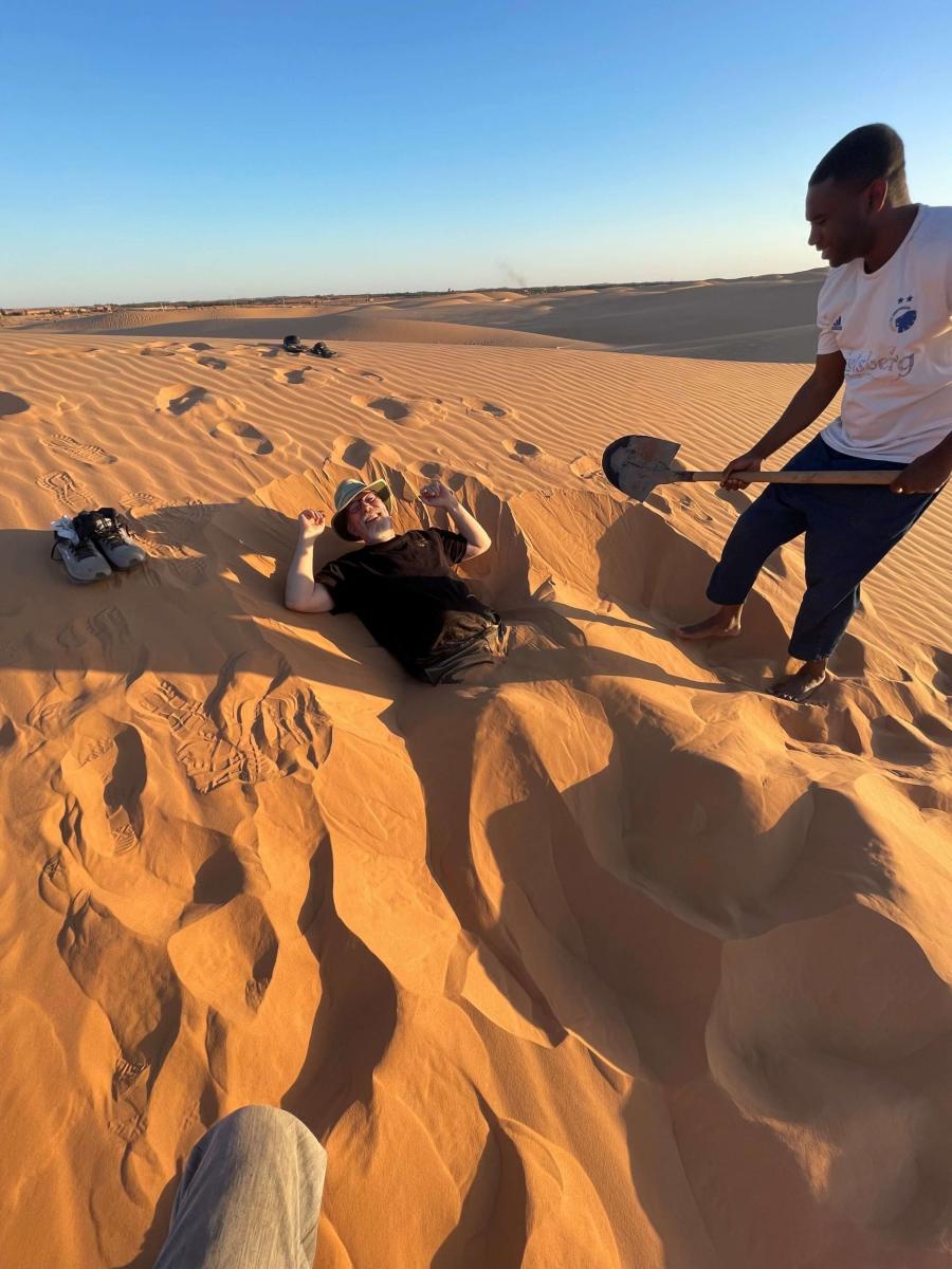Along the way, we stopped to give water to some camels along the side of the highway, and explored the ruins of some old villages nearby. We experienced a very typical, and very crowded, weekly market in town, and got a little sand therapy, getting buried in the warm sand (up to the waist).